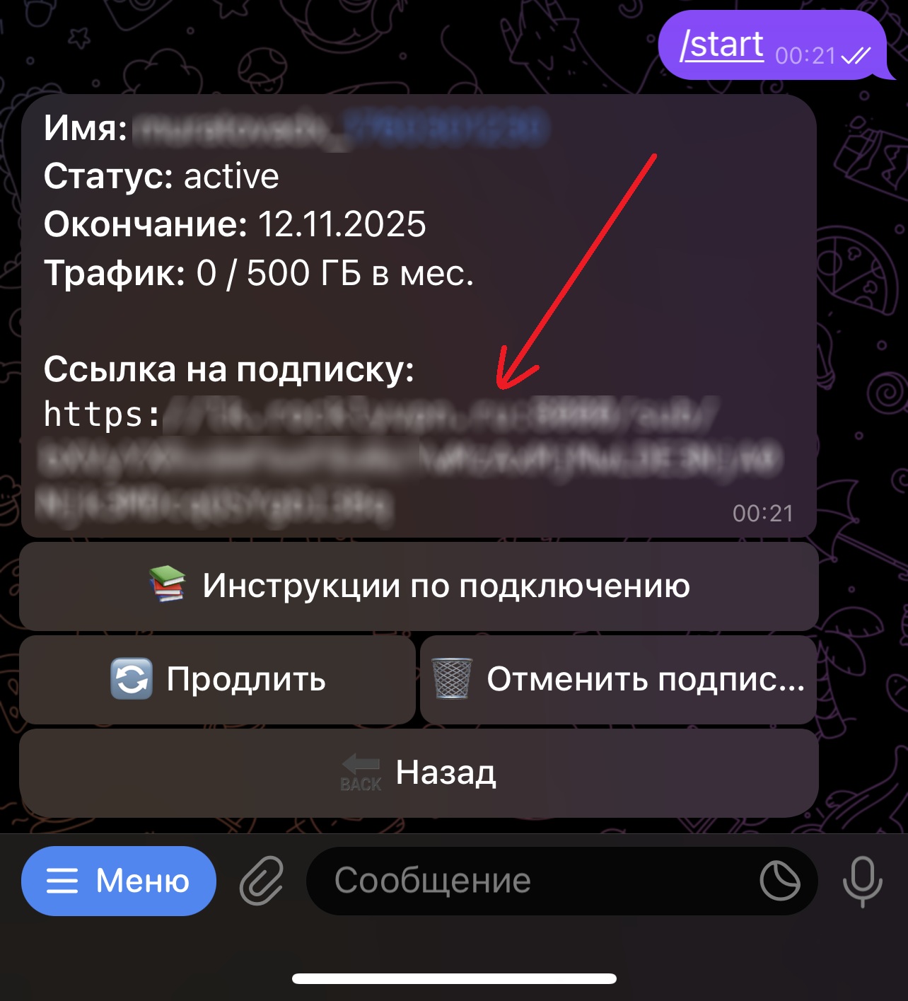 В телеграмм боте скопируйте ссылку на подписку (доступна после оплаты).