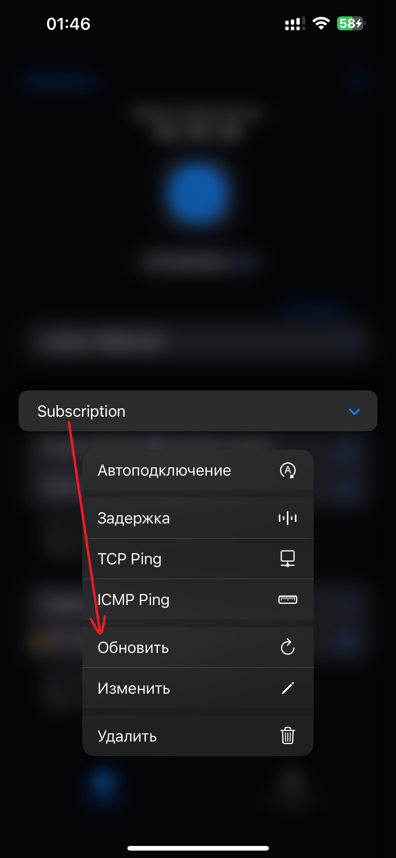 2) Если сервер перестал работать – обновите подписку удеживая верхнюю строчку и выбирая update
